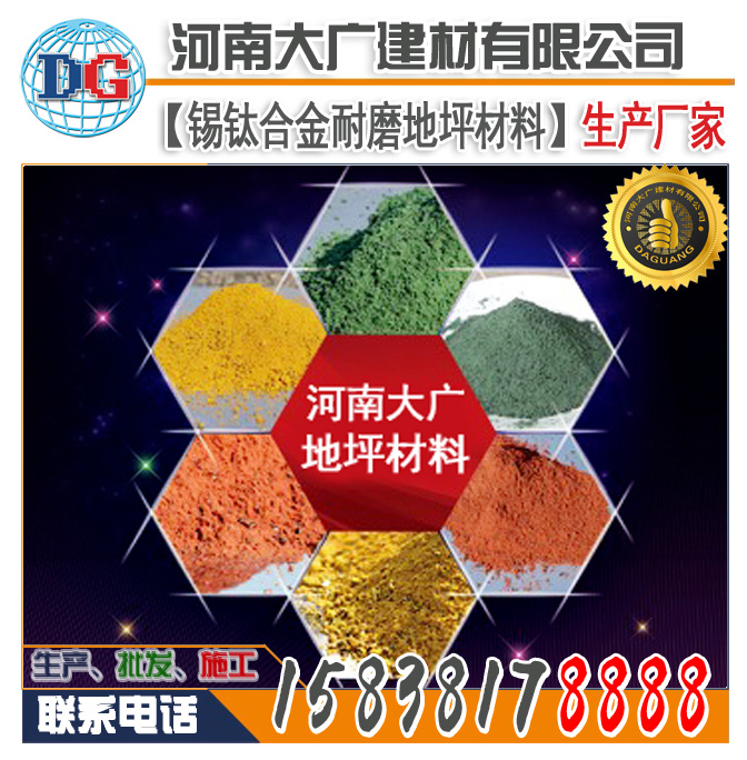 大廣牌錫鈦合金合耐磨地坪材料由一定顆粒級配的錫鈦合金骨料、高標(biāo)號水泥、顏料、微硅粉等其它摻合料和外加劑組成。將其均勻地撒布在初凝階段的混凝土表面,經(jīng)專工門工藝加工,從而使其與混凝土地面形成一個整體。且具有高致密度性和著色的高性能耐磨地面。